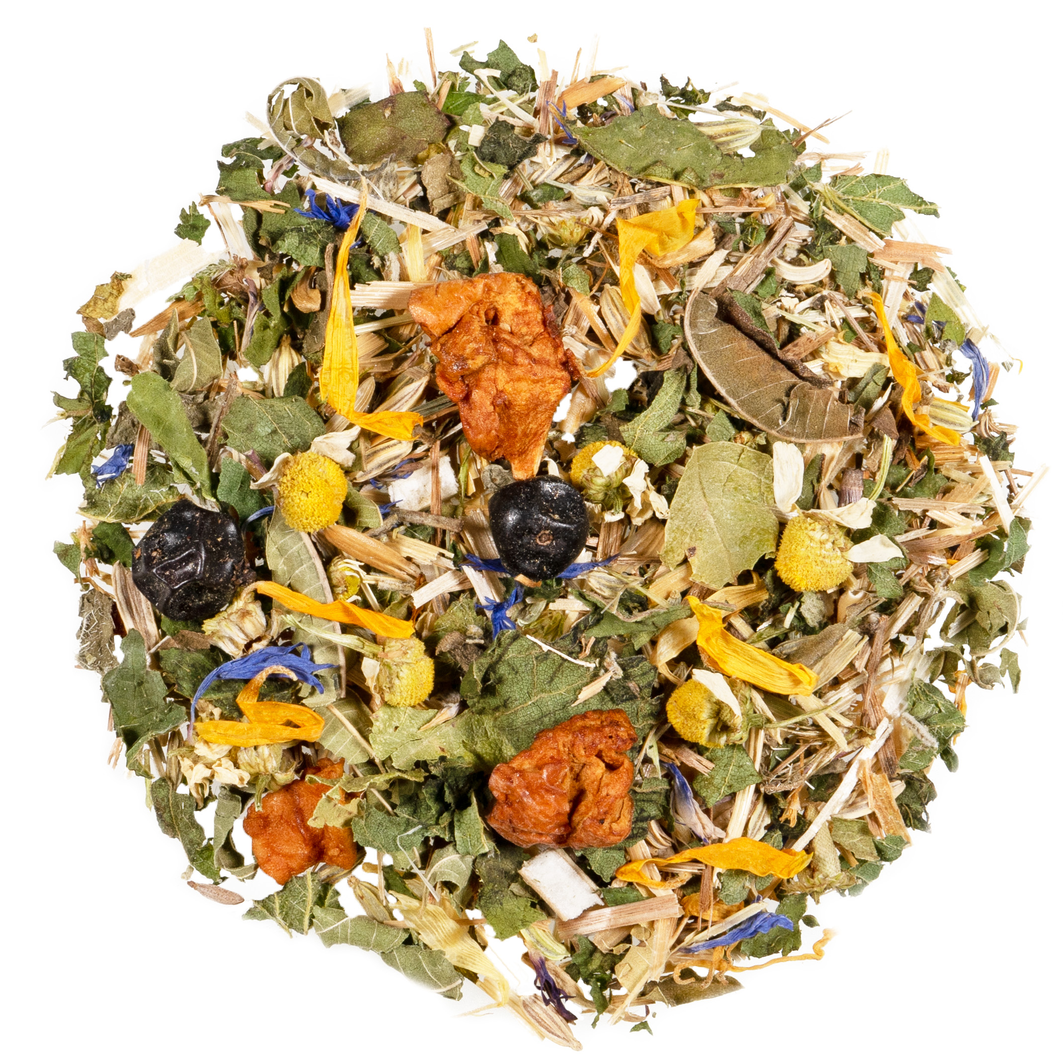 Apfelstücke, Fenchel, grünes Haferkraut, Brennnesselblätter, Verbenenkraut, Salbeiblätter, Löwenzahnkraut, Kamillenblüten, Wacholderbeeren, Riesengoldrutenkraut, Ringelblumenblüten, Kornblumenblüten